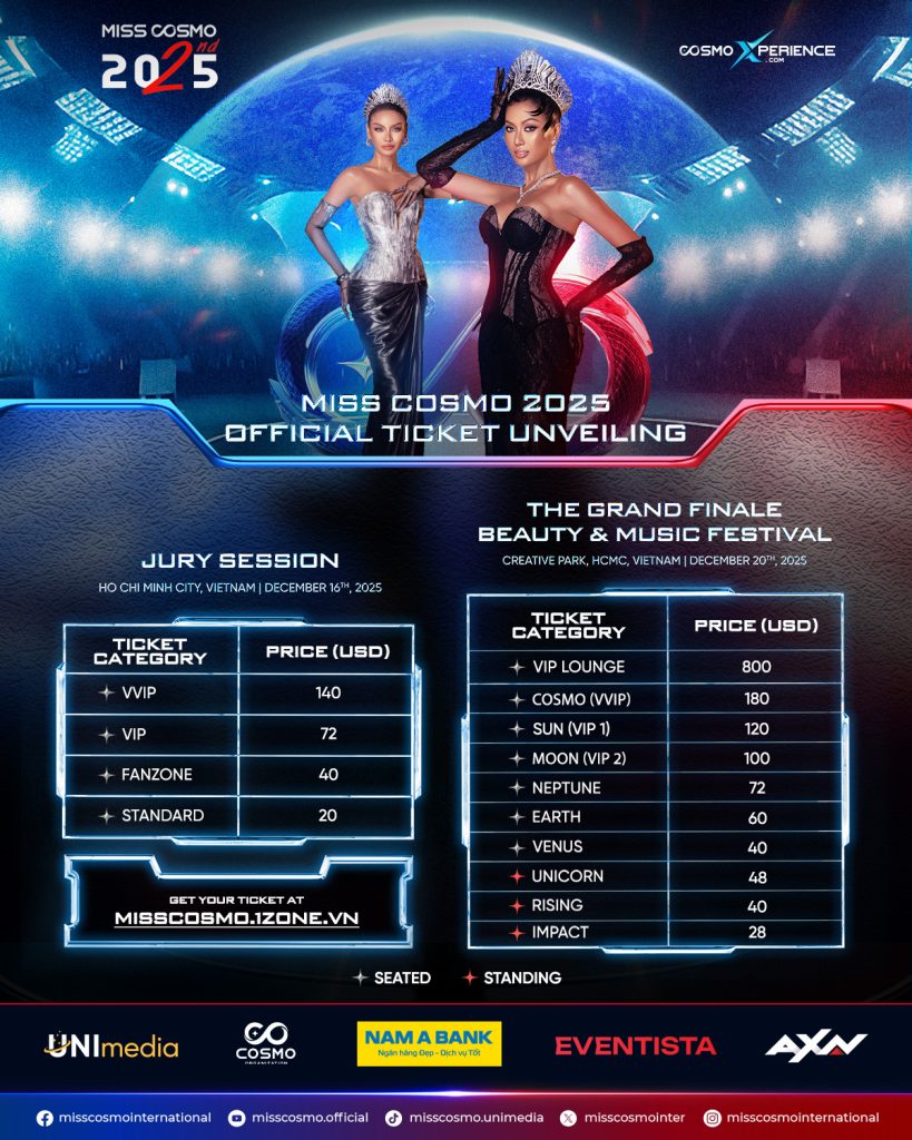 | OFFICIAL TICKET SALE FOR THE MISS COSMO 2025 GRAND FINALE It’s time to secure your special ticket to attend the Miss Cosmo 2025 Grand Finale – The Beauty & Music Festival, the most anticipated event of the competition! Book your tickets now at: – Early Bird Offer: 20% discount on all ticket categories – Promotion period: October 21 – 24, 2025 All tickets are now officially on sale in limited quantities. Don’t miss out, reserve your seat today to secure the best spot at Miss Cosmo 2025, an international celebration of beauty and music. __________ MISS COSMO 2025 GRAND FINALE TICKET PRICES VIP LOUNGE BY NAM A BANK (S-VIP): 800 USD COSMO (VVIP): 180 USD SUN (VIP 1): 120 USD MOON (VIP 2): 100 USD NEPTUNE: 72 USD EARTH: 60 USD VENUS: 40 USD UNICORN (Fanzone): 48 USD RISING (Fanzone): 40 USD IMPACT (Fanzone): 28 USD |