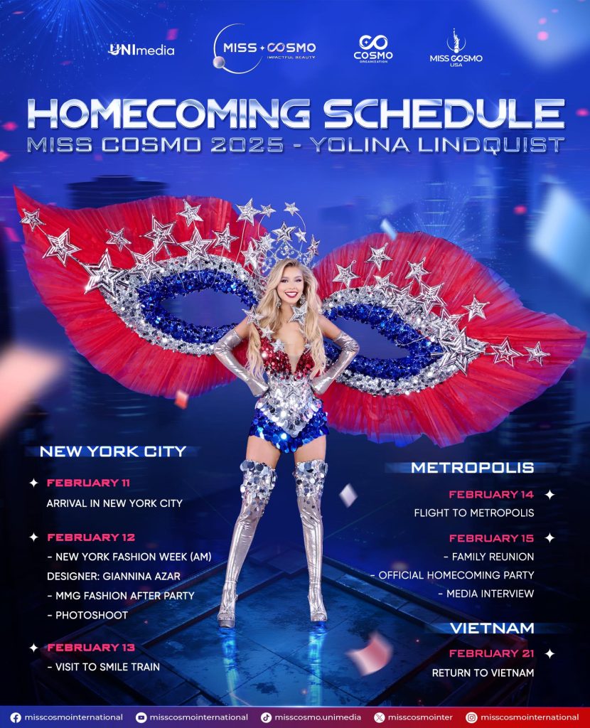 Nearly two months after being crowned, Yolina Lindquist has officially launched her Homecoming tour with a series of engagements in New York City and the state of Illinois. The reigning Miss Cosmo 2025 made a notable appearance as first face at the New York Fashion Week AM – Fall/Winter 2026 show by designer Giannina Azar, alongside participating in diplomatic and charitable activities.