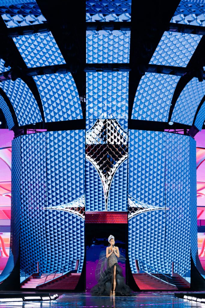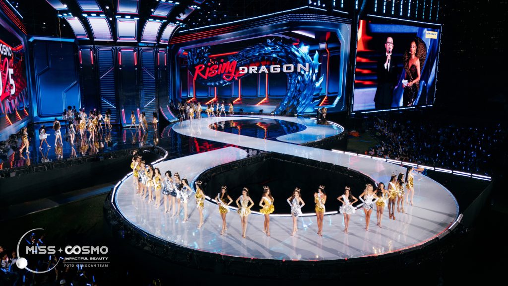Chung kết Miss Cosmo 2025 mở ra bằng màn trình diễn lighting show ấn tượng, đánh dấu thời khắc “Đế chế Rồng” chính thức xuất hiện. Hiệu ứng ánh sáng được thiết kế đa tầng, kết hợp chuyển động sân khấu và âm thanh điện tử hiện đại, tạo nên khoảnh khắc khởi đầu mang tính tuyên ngôn, dẫn dắt khán giả bước vào không gian đặc trưng của Miss Cosmo 2025.