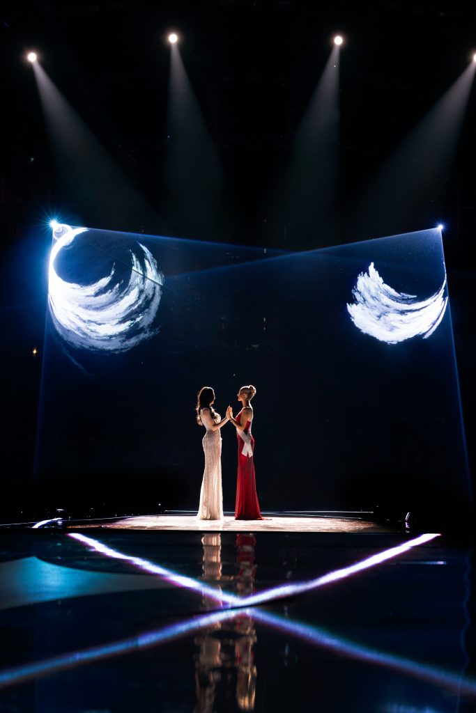 Bên cạnh đó, Miss Cosmo Nicaragua – Marian Rodríguez và Miss Cosmo Myanmar – Myint Myat Moe mang đến màn song ca “The Greatest Show” sôi động, khuấy động không khí sân khấu. Miss Cosmo New Zealand – Katharina Weischede và Miss Cosmo DR Congo – Dorcas Nende tiếp tục chinh phục khán giả bằng giọng hát nội lực qua ca khúc “Never Enough”, tạo nên những khoảnh khắc giàu cảm xúc, tôn vinh tinh thần dám tỏa sáng và vượt qua giới hạn của bản thân.