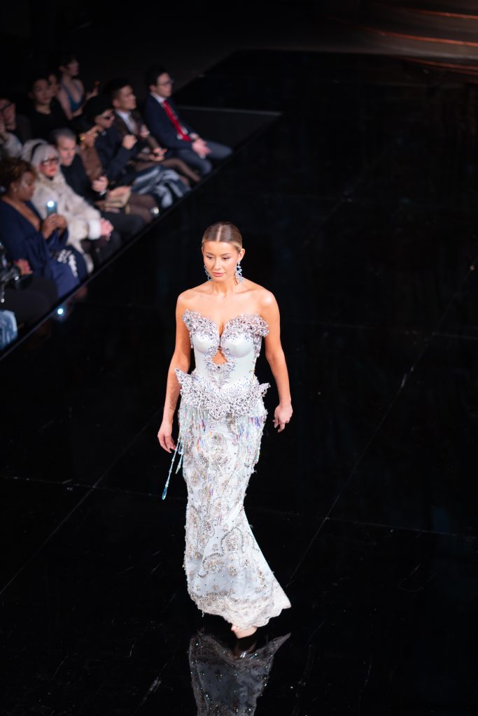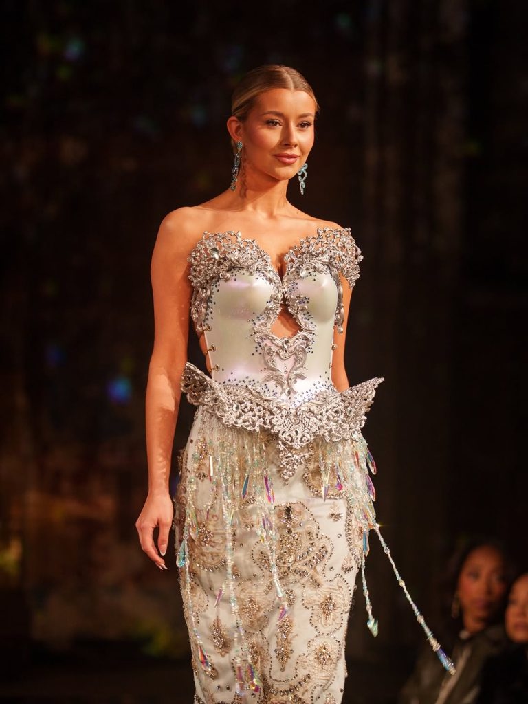 Bộ trang phục được dựng corset chỉn chu, kết hợp kỹ thuật đính kết thủ công trải dài toàn bộ thân váy, sử dụng gam màu ánh bạc và champagne. Thiết kế thể hiện tinh thần thời trang cao cấp theo đúng ngôn ngữ thẩm mỹ của NTK Giannina Azar.